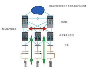然而,應(yīng)用趨勢(云計算和移動應(yīng)用程序)使得在數(shù)據(jù)傳輸流量發(fā)生了改變,由于服務(wù)器之間的互動,造成80%的流量現(xiàn)在是來自于服務(wù)器之間的流通,在關(guān)鍵的核心層出現(xiàn)了瓶頸(如圖所示)。