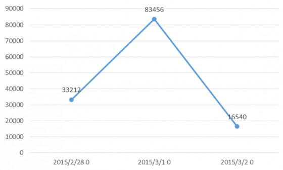 2月28日,上午九點,整個網(wǎng)絡上開始出現(xiàn)對演講者的專訪文字,10點,視頻正式出現(xiàn)??傆嫗?span>3.3萬原創(chuàng)微博數(shù)量。次日1日,達到頂峰,8.3萬。到了2日,迅速回落。截止到2日的下午152分(這個時間點之后,數(shù)據(jù)抓取已經(jīng)無法完成),也只有1.6萬條,即便按全日翻倍計算,3萬條出頭。