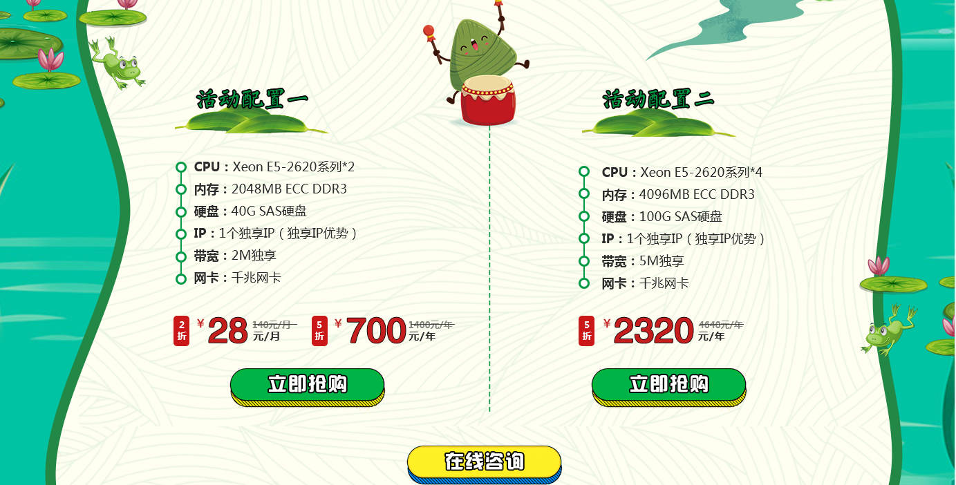 時(shí)值收種的季節(jié),又臨近我國(guó)的傳統(tǒng)節(jié)日--端午節(jié),值此佳節(jié),億恩科技為了回饋廣大新老客戶對(duì)本公司的長(zhǎng)期支持,特推出端午節(jié)云主機(jī)鉅惠活動(dòng);顒(dòng)期間凡是前來(lái)選購(gòu)億恩云主機(jī)的新老客戶,均能享受活動(dòng)價(jià)。